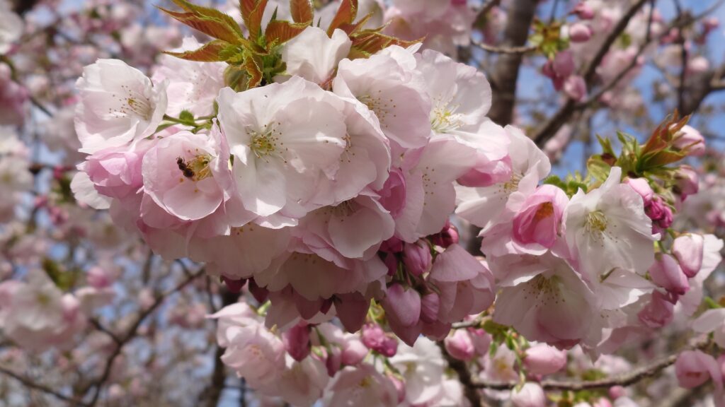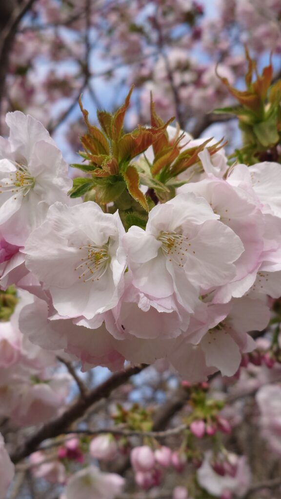 この桜は雄しべが変化した花びらが1枚以上ある花が混在し、12枚以上の花びらをもつ花もあり、