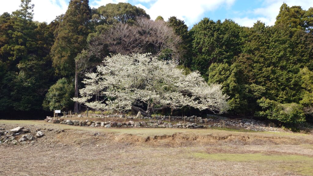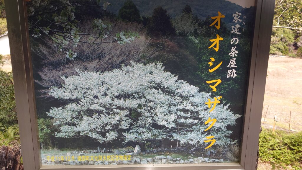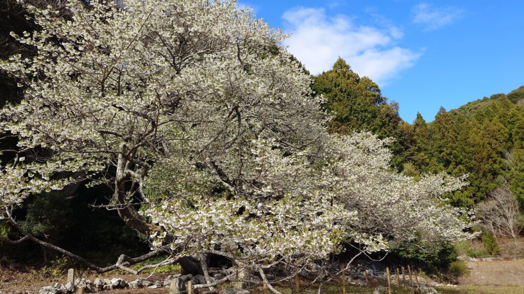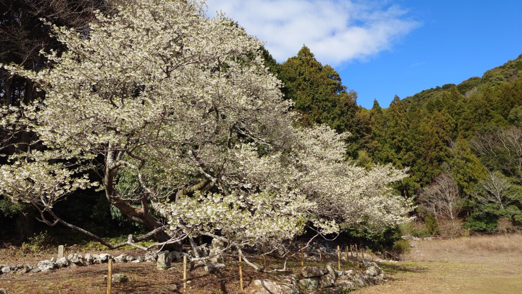 天の岩戸の道中に樹齢360年以上の一本桜、大島桜(おおしまざくら)「岩戸桜」があり、