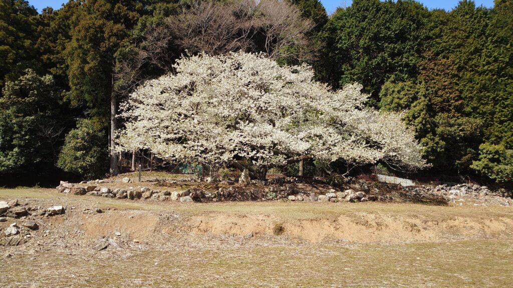 天の岩戸の道中に樹齢360年以上の一本桜、大島桜(おおしまざくら)「岩戸桜」があり、